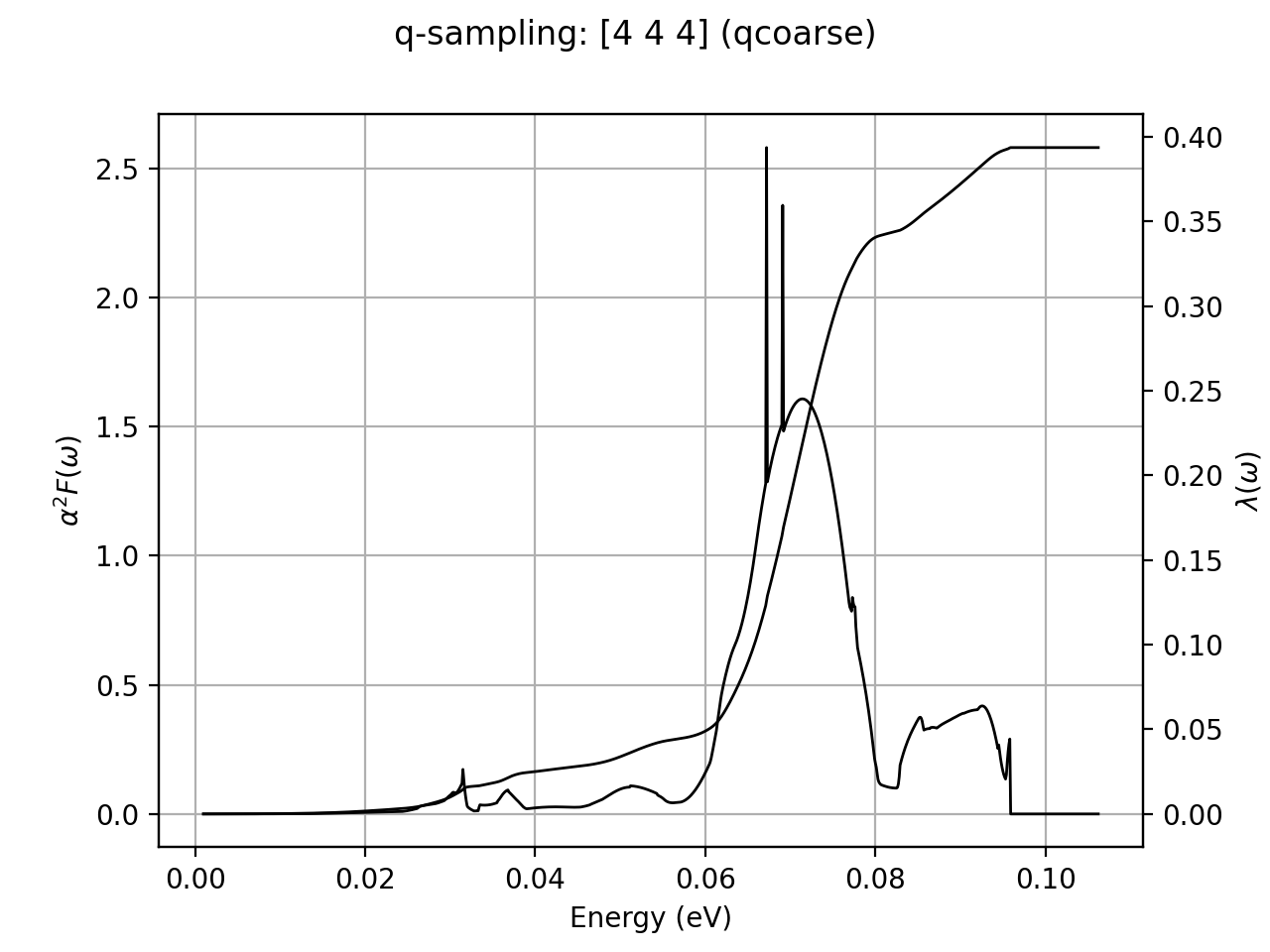 The technique used to compute \alpha^2F(\ww) is defined by ph_intmeth (note the ph_ prefix instead of eph_). Both the Gaussian (ph_intmeth = 1 with ph_smear smearing) and the linear tetrahedron method by [Bloechl1994] (ph_intmeth = 2, default) are implemented. The \alpha^2F(\ww) function is evaluated on a linear mesh of step ph_wstep covering the entire range of phonon frequencies. The total e-ph coupling strength \lambda (a dimensionless measure of the average strength of the e-ph coupling) is defined as the first inverse moment of \alpha^2F(\ww):