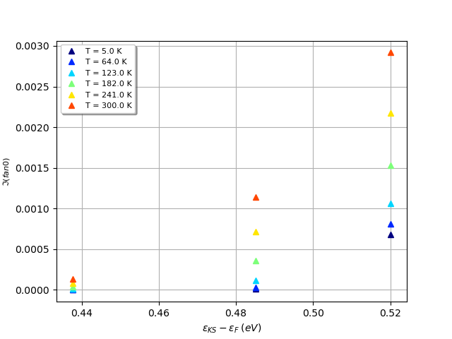 Following this approach, we compute lifetimes on a 90×90×90 \kk- and the integration is perfomed on the same \qq-mesh. You can then run again the transport driver only, by setting eph_task 7 and transport_ngkpt 45 45 45 to downsample the \kk-mesh used to integrate the mobility in \kk-space. This second option has the advantage that it delivers two mobilities in one-shot but it would be overkilling if a 45×45×45/90×90×90 k/q sampling is already enough.