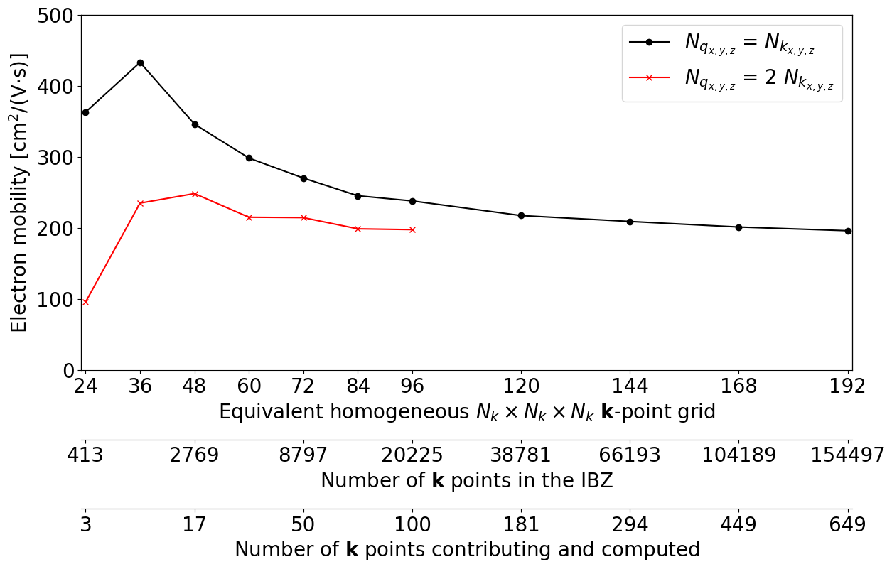 Now that we know how to obtain the mobility in a semiconductor for given \kk- and \qq-meshes, we can give additional details about convergence studies and discuss extra tricks to significantly decrease the computational cost.