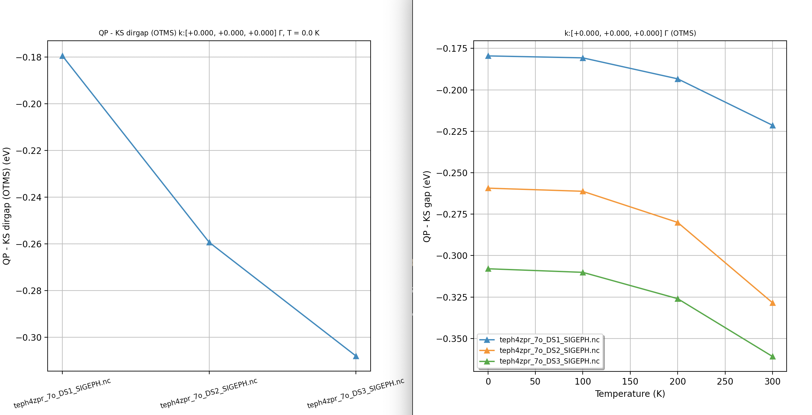 In semiconductors and insulators, indeed, most of the temperature dependence of the electronic properties at “low” T originates from the e-ph interaction and the thermal expansion of the unit cell (topic that, however, won’t be discussed in this lesson). Corrections due to \Sigma^{\text{e-e}} are obviously important as it is well known that KS gaps computed with LDA/GGA are systematically underestimated compared to experimental data. Nevertheless, the temperature dependence of \Sigma^{\text{e-e}} is rather small as long as kT is smaller than the fundamental gap (let’s say 3 kT < E_{\text{g}}).