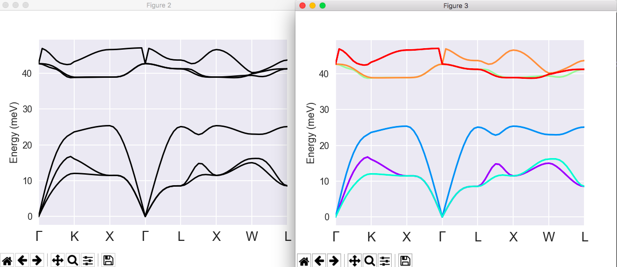 (left) Phonon bands without LO-TO splitting (right) Plot with band connection estimated from the overlap of the eigenvectors at adjacent q-points